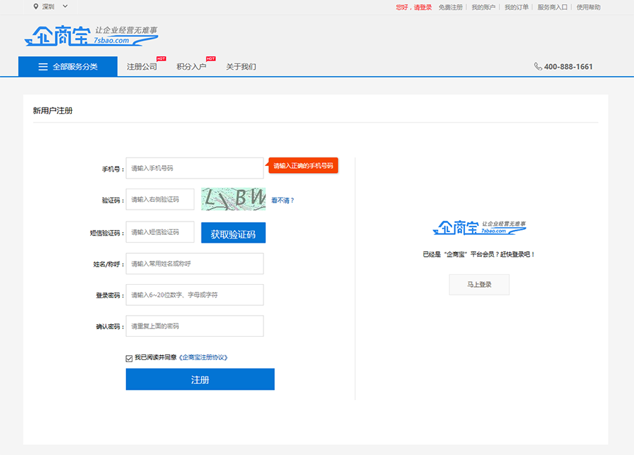 2)根据提示,填写手机号、验证码、密码等,阅读《服务协议》,成功注册账号。