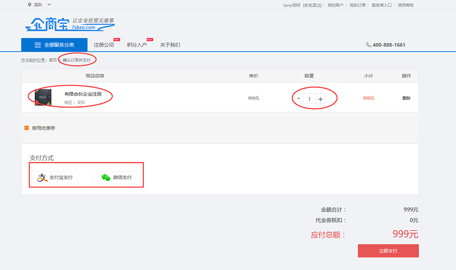 3)确认订单信息,使用微信或支付宝,扫码支付。